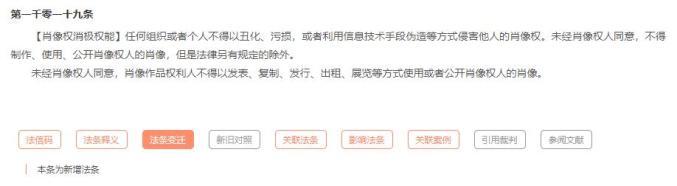 《民法典》第1019条系新增条文。根据《民法通则》第100条、《民法通则意见》第139条规定,肖像权侵权行为通常应具备未经肖像权人的同意、以营利为目的、使用肖像权人的肖像三个构成要件。司法实践中案件复杂多样,当侵权人未经同意擅自制作他人的肖像,如偷拍照片,只因不是使用肖像的行为,不论是否以营利为目的,肖像权人维权都将面临无法可依的局面。为此,本条新增了丑化、污损、利用信息技术手段伪造肖像,擅自制作、使用、公开肖像等侵权行为以及肖像作品权利人的侵权类型的规定,删除“以营利为目的”,扩大了肖像权保护范围。以下小编结合相关条文和案例供读者更好地学习本条内容。