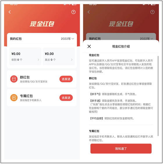 12月24日,数字人民币App再次更新,此次更新增加了“现金红包”功能,用户可用数字人民币给亲朋好友发红包,并在数字人民币App或微信、QQ、支付宝等社交平台领取红包。