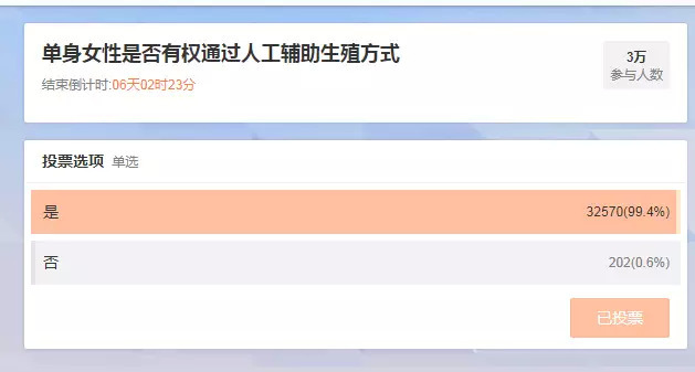 中国日报同时发起的投票,“单身女性是否有权通过人工辅助生殖方式生子?”吸引了超过3万名网友投票,投票结果显示的是一边倒。在3.1万名投票网友里,仅有200名网友持否定的意见。