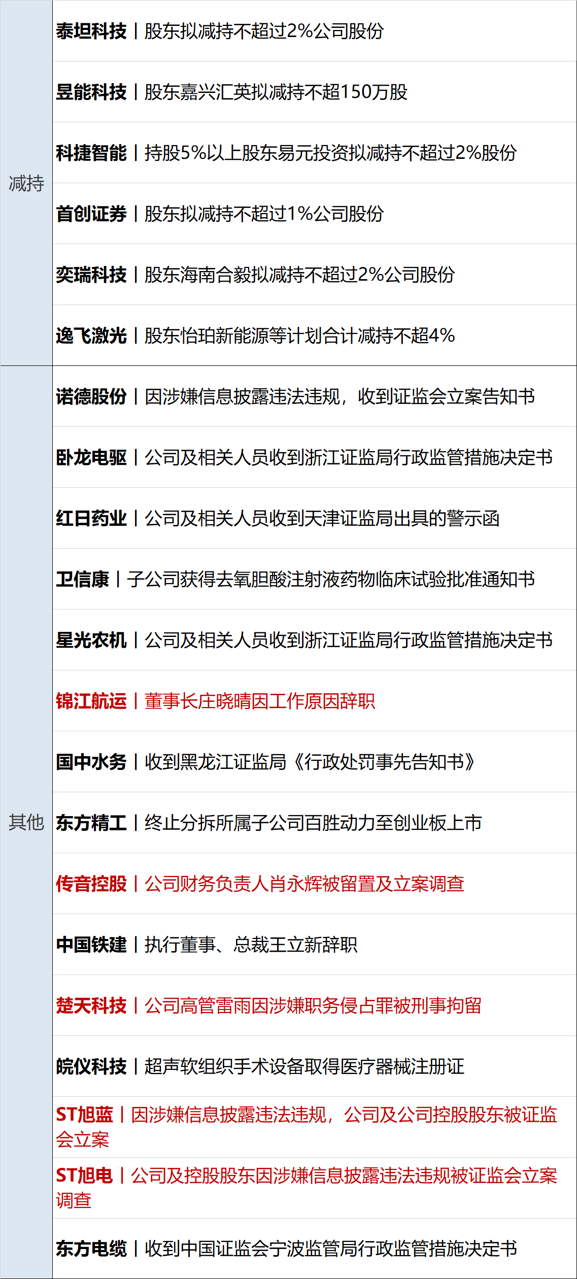 诺德股份(600110,股价:3.02元,市值:52.74亿元)、ST旭电(000413,股价:0.37元,市值:20.84亿元)、ST旭蓝(000040,股价:1.4元,市值:20.82亿元)、嘉麟杰(002486,股价:1.63元,市值:13.56亿元)、华铭智能(300462,股价:8.98元,市值:16.27亿元):9月6日晚,诺德股份ST旭电ST旭蓝嘉麟杰华铭智能五家公司披露了公司或股东被证监会立案。