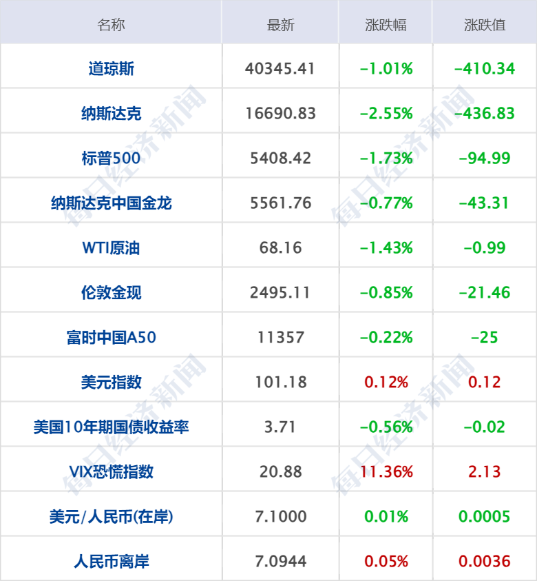 美股三大指数集体收跌,纳指跌436.83点,跌幅2.55%,本周累跌5.77%,周线两连跌,创2022年1月以来最大单周跌幅;标普500指数跌1.73%,本周累跌4.25%;道指跌410.34点,跌幅1.01%,本周累跌2.93%,标普500指数、道指均创2023年3月以来最大单周跌幅,并终结周线三连涨;费城半导体指数跌4.52%,本周累跌12.22%,创2020年以来最大单周跌幅。大型科技股普跌,特斯拉跌超8%,谷歌、英伟达跌逾4%,亚马逊、Meta跌超3%,奈飞英特尔跌超2%,微软跌逾1%,苹果小幅下跌;博通跌超10%,创2020年3月份以来最差单日表现。中概股多数下跌,纳斯达克中国金龙指数跌0.77%,本周累计下跌0.83%小鹏汽车跌超3%,爱奇艺理想汽车富途控股百度跌超2%,哔哩哔哩阿里巴巴微博京东腾讯音乐跌超1%,网易小幅下跌,蔚来涨超3%,满帮涨超1%,唯品会拼多多小幅上涨。