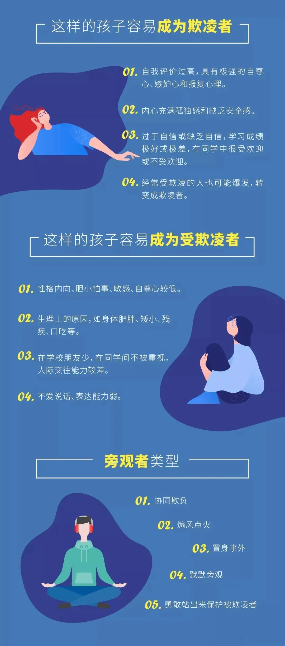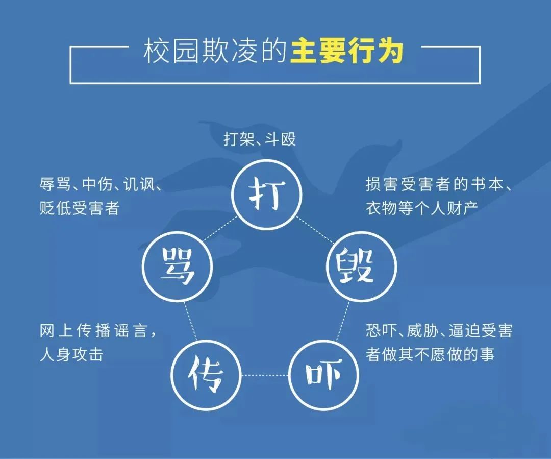 校园欺凌中有三种角色,分别是欺凌者、受欺凌者和旁观者。从性别上看,参与欺凌的人群中男生多于女生,男生喜欢以身体欺凌的方式,女生则喜欢以小团体排挤他人的方式。
