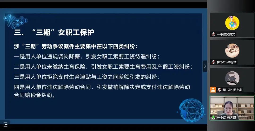活动中,民六庭法官吴博文以“劳动争议案件中举证规则的运用”及“劳动争议涉疫情常见问题分析”为主题进行了授课,法官助理高天琪结合新修订的《中华人民共和国妇女权益保障法》(以下简称《妇女权益保障法》)就“女性就业保护”主题进行了分享,并提示企业应及时根据新修订内容修改完善规章制度等。240余人参加了本次活动。