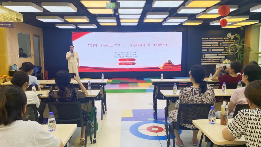 为帮助上城区妇女群众树立依法保卫婚姻的法律意识,准确运用法律保卫自己在婚姻中的权益,营造和谐家庭关系,近日,上城区妇联在采荷街道举办“巾帼和·尚红好女儿”精准普法活动,开展以“婚姻中相关协议的效力”为主题的普法讲座。