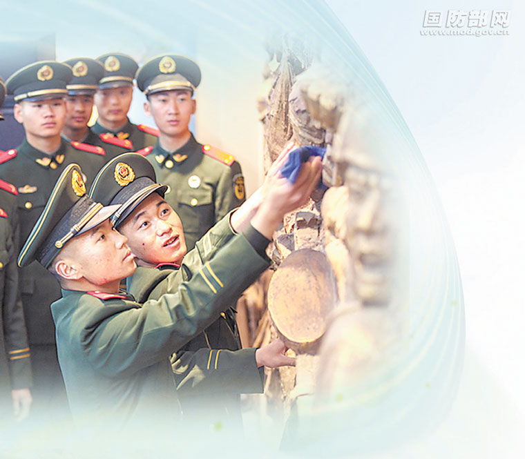 武警某部组织新兵来到支队史馆参观学习。图为新兵正在擦拭英模浮雕。周 静摄