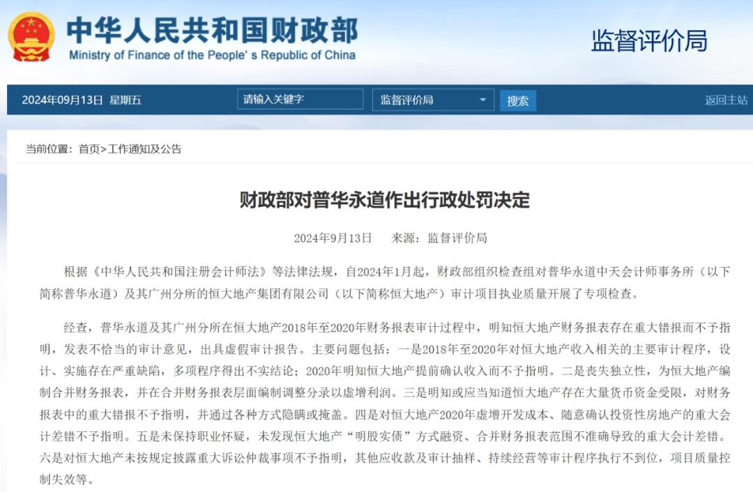 会计师事务所方面,按照《中华人民共和国行政处罚法》有关规定,考虑到中国证监会依据《中华人民共和国证券法》对普华永道涉及恒大地产2019年、2020年审计项目的违法行为,给予没收违法所得并处罚款共3.25亿元的行政处罚,财政部依据《中华人民共和国注册会计师法》,对普华永道涉及恒大地产2018年审计项目的违法行为,给予没收违法所得并处罚款共1.16亿元的行政处罚。同时,财政部依据《中华人民共和国注册会计师法》,给予普华永道警告、暂停经营业务6个月、撤销普华永道广州分所的行政处罚。