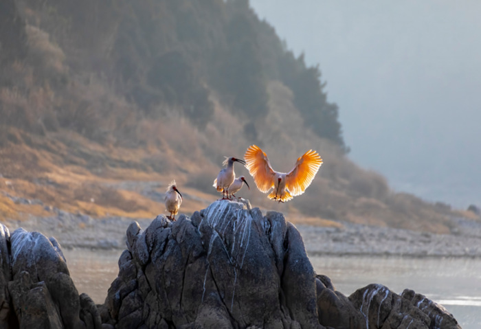 2021年1月28日,朱鹮在陕西省洋县黄金峡镇庞湾村汉江段的河石上栖息 陶本耀摄 / 本刊