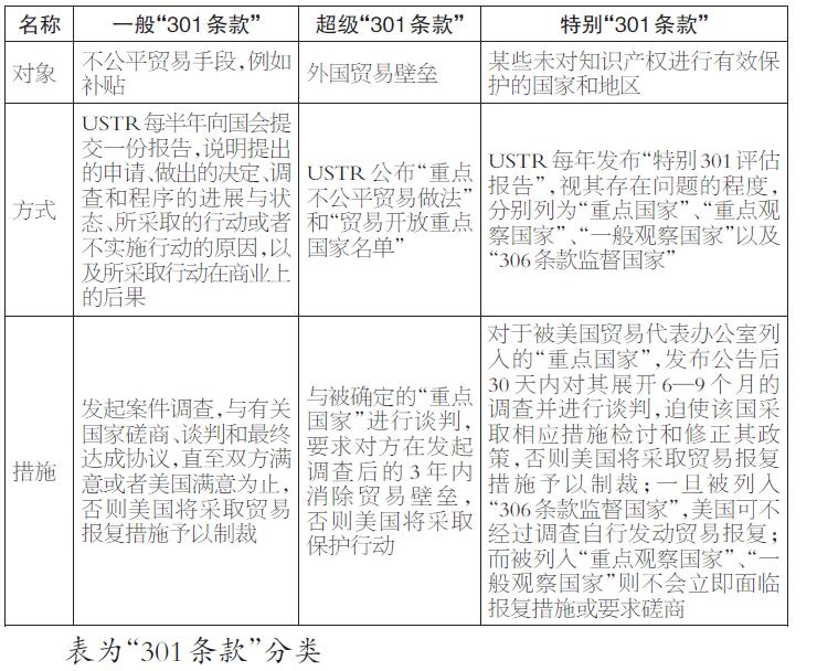 “301条款”分为狭义和广义两种,狭义的“301条款”是对《1974年贸易法》第301条的简称,是美国保护自身贸易的主动性条款,当总统领导的贸易代表办公室认为国外政府的法律、行为等损害到美国贸易利益时,可以直接对相关国家发起调查。除此以外,美国企业或者行业也可以向USTR申请,发起对他国的调查。当美国启用“301条款”时,一般的流程要经过发起调查、双方谈判、施加惩罚措施等环节,直到被调查方消除对美国有害的行为。调查发起的初期,美国贸易代表先进行调查,当确定有损害本国利益的行为时,首选会与外国政府谈判,要求对方解除对美方的损害行为,如果协商无法解除双方的矛盾,将会采取报复措施,例如惩罚性关税、限制对美国出口等。广义的“301条款”除了传统内容之外,还包含另外两个“301条款”,一个是特别“301条款”,主要针对知识产权;另一个是超级“301条款”,保护的是贸易的自由化。