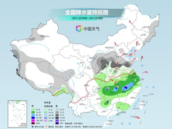 1月31日-2月1日08时,新疆伊犁河谷和南疆西部山区、青海南部、西北地区东北部、东北地区东部、华北西部和南部、黄淮、江淮北部、西藏东部和南部等地部分地区有小到中雪或雨夹雪,其中,陕西北部、山西南部、河北南部、河南北部、山东中南部等地部分地区有大到暴雪(10~11毫米)。湖北北部部分地区有冻雨。江淮东部、江汉东部、江南北部、广西北部等地部分地区有中到大雨,其中,安徽西南部、江西北部、湖南东北部等地部分地区有暴雨(50~70毫米)。
