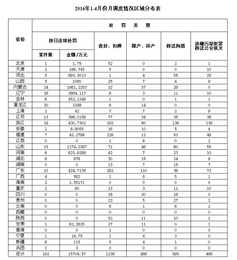 环境保护部向媒体通报了2016年4月各地《环境保护法》配套办法执行情况以及与司法机关联动情况,并对广东、浙江、江苏、福建、山东、辽宁、内蒙、黑龙江等地加大执法力度、依法严查环境违法案件表示肯定。
