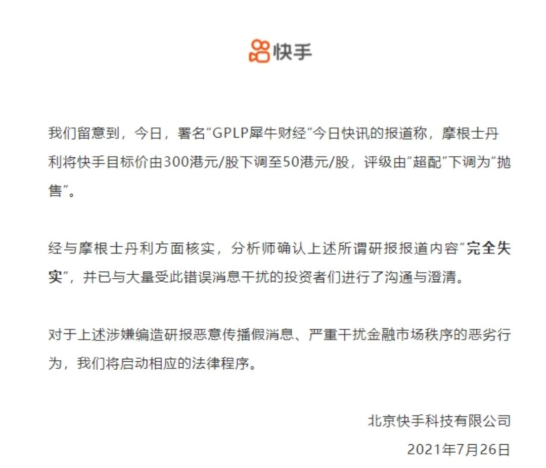 7 月 26 日晚间消息,据「快手黑板报」微信公众号,快手发布公告回应今日摩根士丹利将快手目标价由 300 港元/股下调至 50 港元/股,评级由「超配」下调为「抛售」的传闻,表示传闻不实,并将对恶意传播假消息、严重干扰金融市场秩序的恶劣行为启动相应的法律程序。(来源:新浪科技)