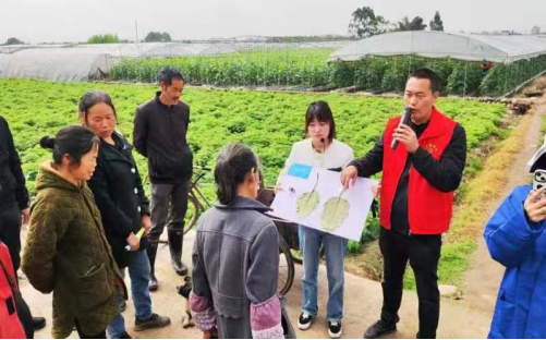 当前正值黄瓜、茄子、番茄等蔬菜病虫防治关键时期,乡村植保员认真履行病虫情报侦察兵、植物保护法律法规宣传员、病虫防治技术指导员、农药使用调查员“一兵三员”的工作职责。2023年4月6日乡村植保员在甘江镇五星村开展科学安全用药及病虫防治指导,共发放《如何科学安全使用农药》、《农作物病虫害防治条例》等宣传单200余份,培训蔬菜种植户30人次。通过培训,切实提升了蔬菜种植户病虫害识别、防控、科学安全使用农药的意识和能力。
