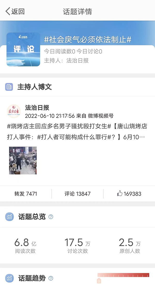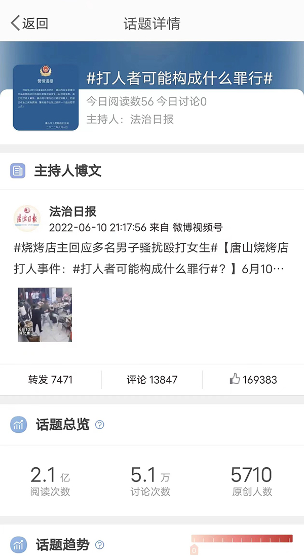 唐山烧烤店打人案法治日报微博2个原创话题合计总浏览量近9亿次