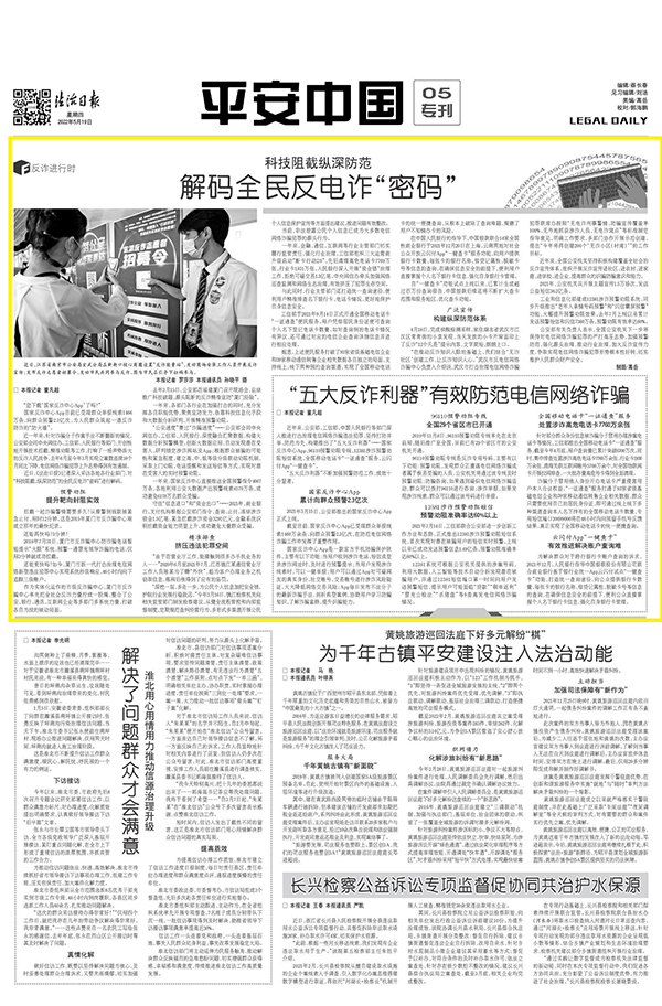 关注老年人、残疾人、妇女儿童权益保护。法治日报微信公众号开设“全民反诈在行动”专题,推出《“黄昏恋”背后的“甜蜜陷阱”》等38篇稿件,聚焦养老诈骗背后的老年人权益保护问题。制作微视频《“宪”在行动|“吃讲茶”里话民主 让“她”权益被保护》,直面妇女权益保障领域存在的问题,探讨解决之道。