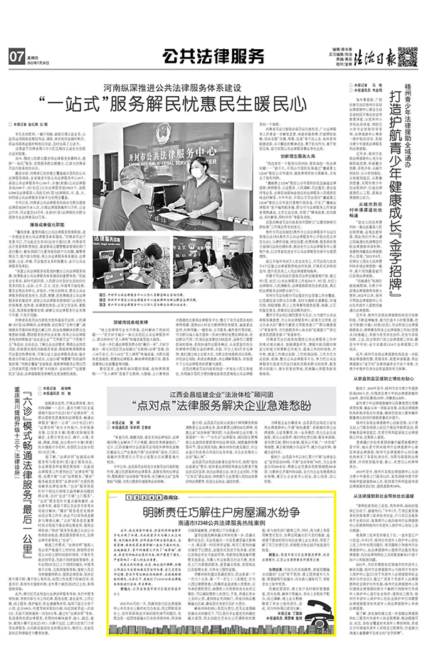 积极搭建公共法律服务平台。做好《法治日报》公共法律服务版,加强“12348咨询台”栏目建设。法治日报微信公众号设置“检索咨询”菜单服务栏,方便读者查询法律法规、咨询各类热点难点法律问题。
