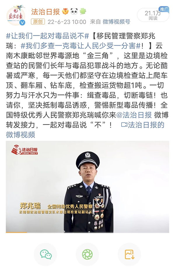 6•26国际禁毒日,推出新媒体作品《让我们一起,对毒品说“不”!》,相关话题达到近亿阅读量。法治日报微信平台发布稿件《一线禁毒警察讲述:从未后悔为“无毒”而战!》,后台读者致敬留言超过上限。