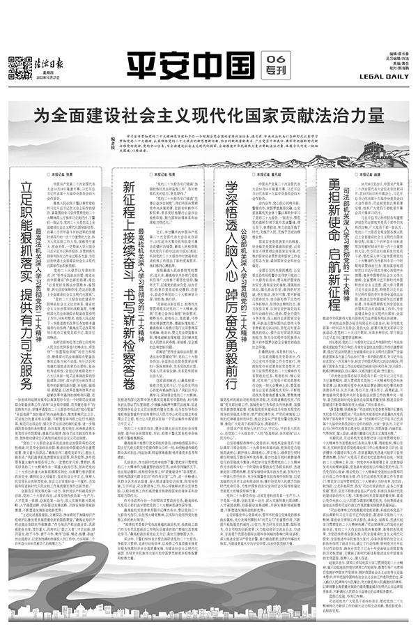 策划推出“为全面建设社会主义现代化国家贡献法治力量”专版,对中央政法机关认真学习贯彻党的二十大精神进行全方位多角度深入报道(点击图片查看)