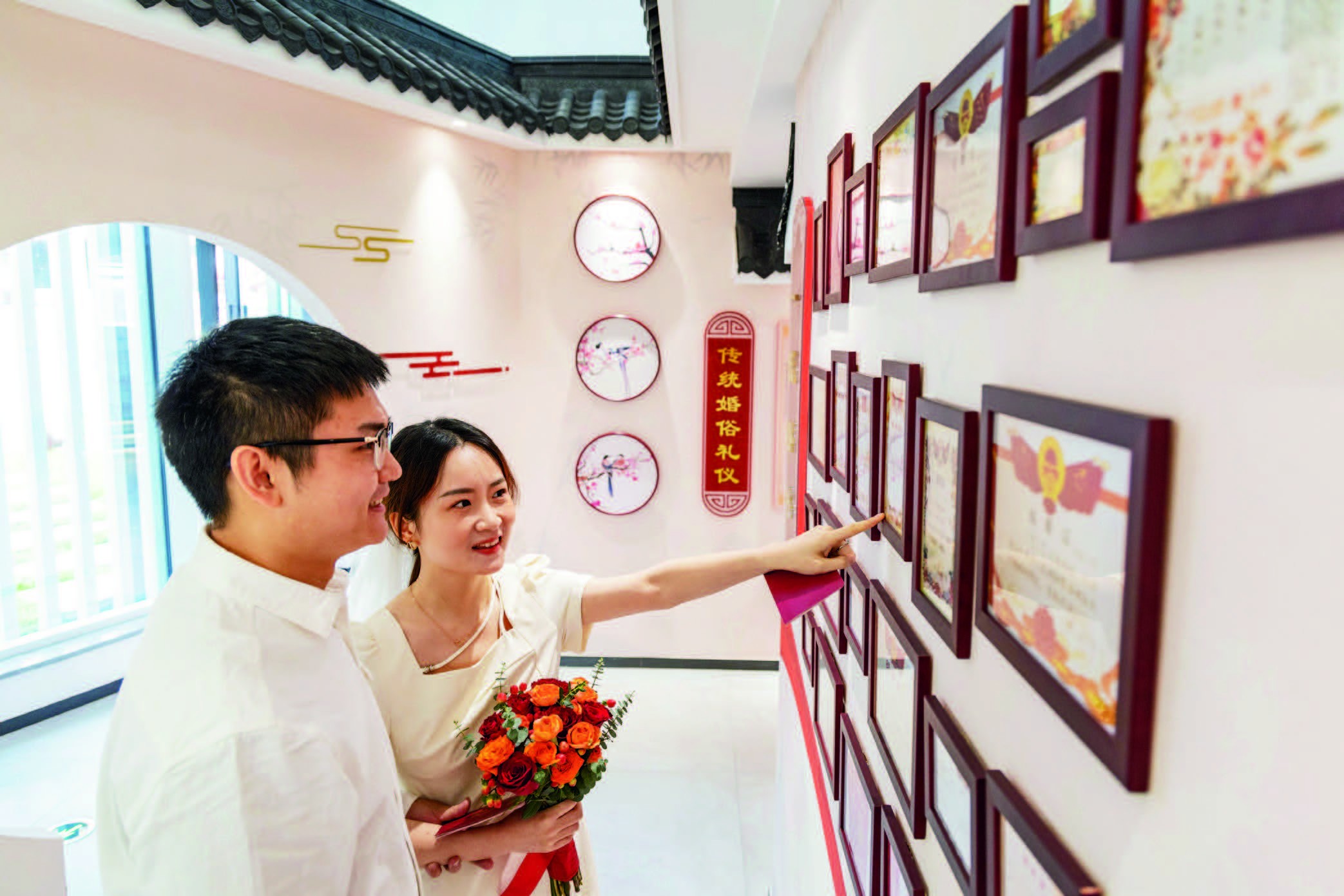 2023年 3月31日,在重庆市两江新区婚姻登记处,新人领取结婚证后参观婚俗文化展厅。