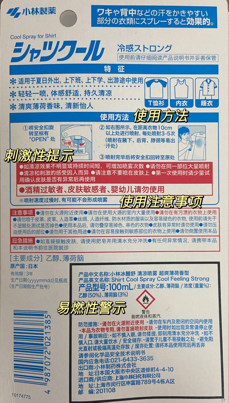 我们认为,针对降温喷雾这类产品,除应当对其易燃性进行明确标注外,使用和存放的安全须知和警示,刺激性和冻伤风险提示等信息都必不可少。