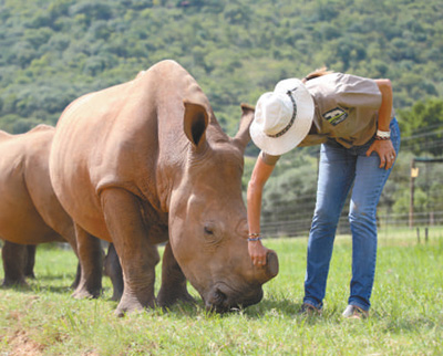 在南非西北部的一家犀牛孤儿院,工作人员正在照料一只被切掉角的犀牛。本报记者 吕 强摄