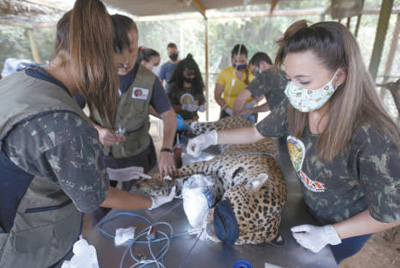 9月27日,在巴西戈亚斯州,动物保护中心工作人员医治在潘塔纳尔湿地火灾中受伤的美洲豹。新华社发