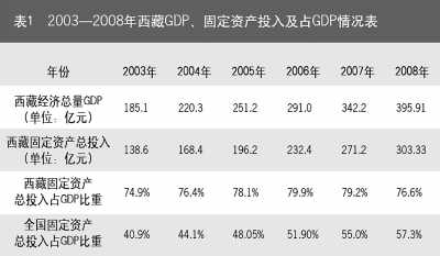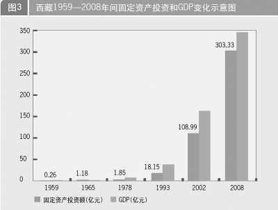 西藏的经济增长受投资拉动影响显著。通过对西藏自治区固定资产投入和地方财政收支情况进行分析后发现,从1959年到2008年间,西藏固定资产投资从0.29亿元增长到303.33亿元,年均增长率达到15.2%。从1985年,即西藏宣布对外开放的第二年开始,固定资产的投入就占当年GDP的42.2%,较过去增长了至少10个百分点。从此,西藏固定资产的投入开始大幅度增加,占GDP的比重保持了较高水平。1984—1994年的10年里,西藏固定资产的投入占GDP的比重均在40%以上,1995年这一比例上升至66%,1996—1998年的2年里,这一比例回落至45%—47%之间。此后,西藏对固定资产的投入再度加快,从2003年到2008年的6年里,西藏固定资产投入占GDP的比重始终保持在75%以上,比全国平均水平高出20多个百分点。