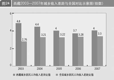 发展不平衡的问题,特别是城乡间业已存在的发展差距广泛存在于发展中国家和地区。虽然政府正在采取措施,力图缩小西藏的城乡差距,并且从过去几年的情况看,这一差距总体呈缩小的态势,但与全国其他地区相比,西藏的城乡差距仍比较突出。以现阶段政府和民众最关心的收入水平为例,2007年西藏城乡居民的收入水平不仅在量上与全国平均水平分别相差19.2%和32.2%,其4.0∶1的差距也远高于全国3.3∶1的水平,与同处西部的甘肃、贵州、青海和宁夏等省区一道,为全国城乡差距较大的地区。由此可见,以城乡差距为代表的区域发展不平衡问题将是西藏经济发展进程中需要面临的又一大障碍。