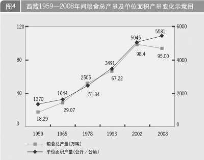 2008年,西藏第一产业增加值达60.51亿元,占GDP的15.3%。西藏粮食播种面积17.02万公顷,粮食产量达到95万吨,粮食生产总量已经连续10年稳定在90万吨以上,每公顷耕地的粮食产量达到5581公斤,较1959年的1370公斤/公顷增长了3.1倍。据对统计数据的分析表明(注7),2008年,西藏人均粮食产量约333公斤,人均占有量近1公斤/天。而1959年实行民主改革前,西藏的年人均粮食产量仅为150公斤左右,人均占有量不足0.5公斤/天。