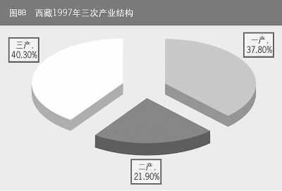 1959年,西藏一产、二产和三产在GDP中的比重分别为73.6%、12.6%、13.8%,第一产业增加值占GDP的70%以上,是一个典型的农业社会。1997年,西藏一产、二产和三产在GDP中的比重分别为37.8%、21.9%、40.3%,第三产业增加值占GDP的40%以上,第三产业成为第一大产业。2008年,西藏一产、二产和三产在GDP中的比重分别为15.3%、29.2%、55.5%,第三产业增加值占GDP的55%以上,第三产业的主导地位日益突出。