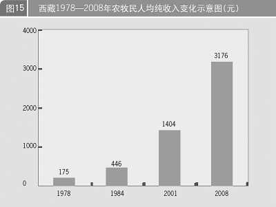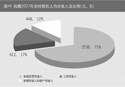 2008年,西藏农牧民人均纯收入达到3176元,是1984年和1978年的7.1倍和18.1倍,从1978年到2008年的30年,其年均增长率超过10%,达到了较高水平(注19)。与此同时,2007年西藏农村家庭平均每人总收入中,转移性和财产性收入达到448元,占其总收入的12%。