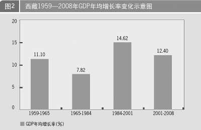 1984年西藏实行改革开放,开放的发展战略和市场的基础作用为西藏的经济提供了强大支持,与此同时,通过中央巨大的政策和财力支持、内地较发达省市的对口支援以及西藏各族人民的努力,西藏经济进入了历史上增长最快的时期。经济总量从1984年的13.68亿元快速增长到2008年的395.91亿元,按可比价算,25年里经济总量增加了11.3倍,年均增长率达到10.5%的高水平。为了促进西藏经济更好、更快地发展,中央于2001年召开第四次西藏工作座谈会,主要研究西藏的发展议题,确定了国家投资的117个项目,总投入约312亿元,此外,中央提供的财政补助约380亿元,全国对口支援的70个项目和援藏资金达30多亿元。在投入的有力拉动下,西藏经济总量从2001年的139.16亿元增加到2008年的395.91亿元,年均增长率仍保持了12.4%的高水平。2006年,西藏人均GDP历史性地突破了万元,摆脱了长期处于全国末尾水平的境地(注4)。