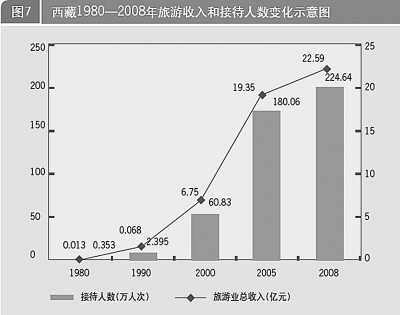 旅游业是公认的资源节约、环境友好型产业,西藏具有丰富的旅游资源,随着开放与发展步伐的加快,西藏旅游业得到了快速发展。1990年到2008年,西藏旅游业收入及其在GDP中的比值整体表现为显著增长趋势。旅游总收入从1990年的684万元增长到2008年的22.59亿元,增长了329.2倍,与2000年相比,增长了2.3倍。1990年旅游总收入相当于GDP的0.2%,2008年上升到5.7%。
