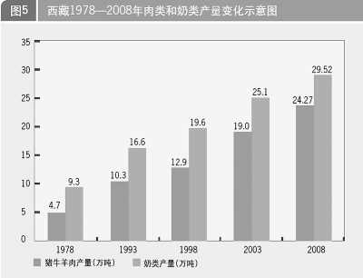 2008年,各类牲畜存栏达2400万头(只),而1959年西藏牲畜总量不足1000万头(只),相对于1959年增长了1.5倍。此外,西藏的畜牧业商品化率也有显著提高。据调查,民主改革前西藏主要牲畜的出栏率不足10%,2008年,西藏的牛、猪、羊的出栏率分别达到了19.8%、57.20%、30.80%。2008年,西藏牧业产值达到38.96亿元,比1959年实际增长5.1倍。肉类产量24.27万吨、奶类29.52万吨,分别比民主改革前增加2倍以上。
