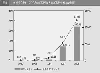 讨论增长与发展,首先必须研究发展的基础和条件。2008年西藏的GDP为395.91亿元,人均GDP达到13861元。虽然这一指标与全国人均水平22698元相比还有不小的差距,但应该看到,1959年西藏民主改革时期,全区生产总值只有1.74亿元,人均GDP仅为142元(注1),西藏今天的经济增长是从如此低的水平开始起步的。