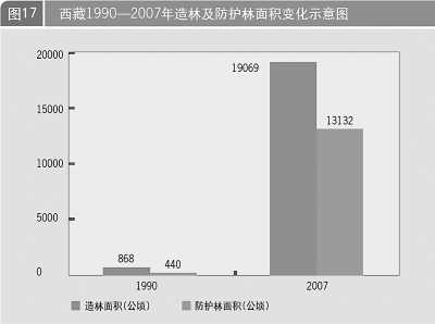 在天然草地和林木的保护方面,政府实行限额采伐措施,以严格控制森林的采伐规模。同时,对采伐迹地进行及时更新,恢复森林植被。在影响长江下游生态的江达、贡觉、芒康三个县实施西藏长江上游天然林资源保护工程。在风沙危害和水土流失严重的金沙江、澜沧江、怒江上游及雅鲁藏布江流域实施退耕还林工程。政府还大力推行能源替代建设工程,营造薪炭林,推广太阳能以保护天然灌木植被。西藏自治区人民政府先后制定了《西藏自治区造林绿化规划》和《关于加快造林绿化步伐的意见》。通过对西藏天然林资源的有效保护和植树造林,西藏森林覆盖率不断提高。造林面积从1990年的868公顷增长到2007年的19069公顷,增长了20多倍,其中对生态环境保护具有重要作用的防护林面积由1990年的440公顷增长到2007年的13132公顷,增长了近30倍(注24)。
