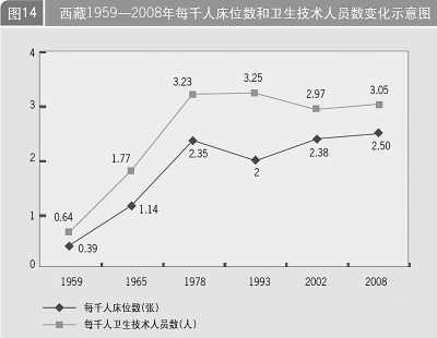 民主改革以来,鉴于旧西藏只有3所官办的藏医机构和少量私人诊所,医疗设备极其简陋,医务从业人员不足400人,每千人拥有医务人员还不到0.4人的状况,国家对西藏全区人民实行特殊的卫生保健政策。在城镇实行个人医疗资金账户和公办民助相结合的医疗费用承担办法,在西藏农牧区实行免费医疗。近50年来,国家累计拨付专项经费18亿多元用于发展西藏的医疗卫生事业,每年用于农牧民的医疗补贴超过2000万元。2008年底,西藏全区卫生机构达到1339个,比1959年增长了近20倍;全区卫生机构拥有床位从1959年的480张增加到2008年的7127张,每千人拥有床位为2.50张,比1959年增加了2.11张;全区卫生技术人员从1959年的791人增加到2008年的9098人,每千人拥有卫生技术人员3.05人,比1959年增加了2.41人。西藏自治区每千人拥有床位数和卫生技术人员分别高于全国平均水平,也高于中等收入国家平均水平(注18)。