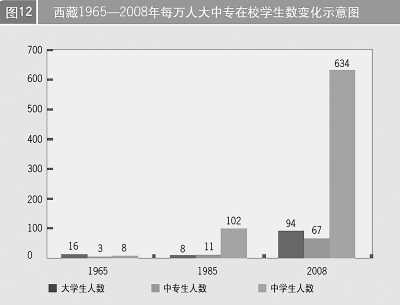 人力资本是对人力进行投资所形成的资本,是体现在人身上的体能、技能、知识和经验的总和,具有其他资本所无法代替的价值。当今世界,人力资本成为推进经济社会发展的决定性资本(注29)。从纵向看,以藏族为主的西藏人口的人力资本得到了显著提高,但这样的提高度还不能适应经济的快速发展,尤其是进行横向比较后,差距比较明显。2008年,中国国民的平均受教育年限在8.5年左右,而西藏居民的受教育年限仅为6.3年,与西部的贵州、宁夏、甘肃、青海等一同处于全国谷底。同年,西藏每万人中接受高等和中等教育的学生人数分别为94人和67人,远远低于全国平均192人和198人。