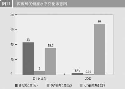 第三,西藏的人口死亡率显著下降。民主改革前,西藏人口的平均死亡率高达28‰,特别是妇女、儿童等高风险人群死亡率更高,分别为50‰和430‰。目前,西藏孕产妇死亡率由和平解放初期的50‰下降到2007年的3.1‰,婴儿死亡率由和平解放初期的430‰下降到2007年的24.5‰。