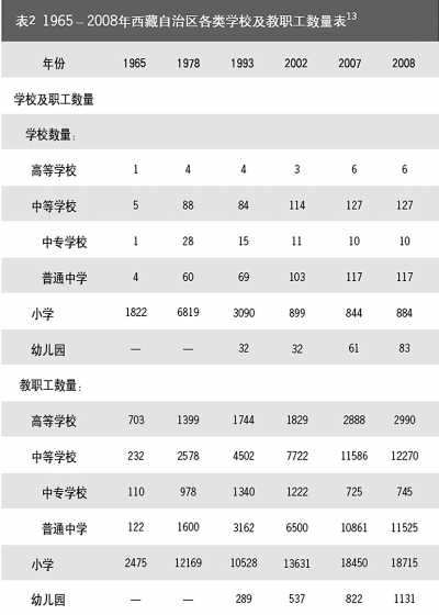 西藏自治区将教育体系的建设作为普及科技文化、提高人力资本的重要一环。2008年底,西藏全区共有各级各类学校1017所,其中小学884所,普通中学117所,中等专业学校10所,高等学校6所。目前,西藏已初步建立起包括幼儿教育、中小学教育、高等教育、职业教育和成人教育在内、具有藏族地方特色的国民教育体系(注13)。而民主改革前,寺院垄断着教育,全区仅有2000余名僧侣和贵族子弟在旧式官办学校和私塾学习,广大农牧民群众基本没有受教育的机会和权利。