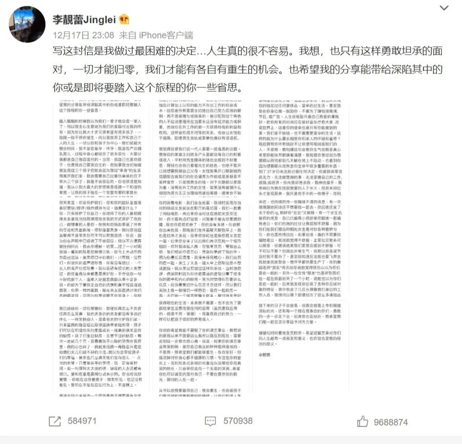 12月17日晚11时,王力宏前妻李靓蕾发文,称王力宏在婚姻存续期间存在行为不端,表示夫妻俩除了在经济上存在诸多矛盾,还爆出王力宏婚内期间有出轨的现象。