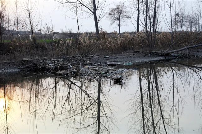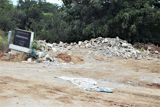 郑国渠首遗址被破坏情形,遗址标志石碑前堆积建筑垃圾