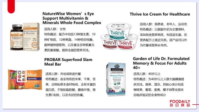 全营养型的产品我们选择了4个例子,分别是适合女性的膳食补充剂、适合外出人群的全食代餐棒、适合运动员、老年人和病患者的全营养冰淇淋,以及适合40岁以上人群的全食物来源的膳食补充剂。