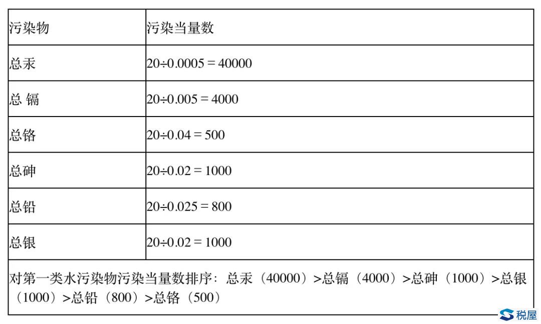 1、某企业8月向水体直接排放第一类水污染物总汞、总镉、总铬、总砷、总铅、总银各20千克。已知水污染物污染当量值:分别为总汞0.0005、总镉0.005、总铬0.04、总砷0.02、总铅0.025、总银0.02。