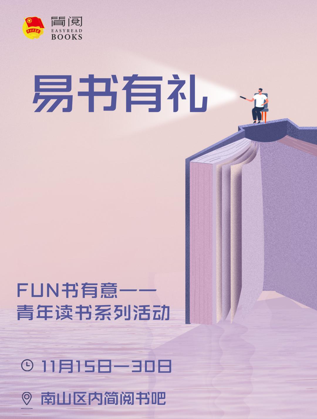 11月是深圳读书月南山共青团的“FUN书有意青年读书系列活动”在南头古城、蛇口、华侨城空体、简阅书吧等地开展了形式不同的读书活动这周末,还将带来趣味的读书活动通过沉浸式阅读中体验人生百态通过聆听专家分享了解更多女性安全知识……沉浸式阅读工作坊Fun书有意活动时间 11月27日15:30-17:00活动地点 南山区华侨城创意文化园F106B空体新媒体实验室二楼活动主题 沉浸式阅读工作坊——觉醒新青年“觉醒年代剧本节选分享”活动介绍 邀请参与者通过角色扮演,一起朗读戏剧文本,讨论剧本内容,以角色代入的方式理解人物情绪和剧情走向,体验百态人生。活动流程 1.女性安全与自我意识主题分享2.“女性如何在家庭生活中维护自身合法权益”法律知识普及报名方式 扫描下方二维码填写表单“古城寻书”、“易书有礼”、“自然物语艺术展”三个活动将持续到11月30日感兴趣的小伙伴记得参加哦~古城寻书Fun书有意活动时间 2021.11.25-11.30活动地点 南头古城简阅书吧活动介绍 店内寻找盲盒图书,完成30分钟沉浸式阅读挑战,即可获得;如果不喜欢,交还工作人员,期待它能