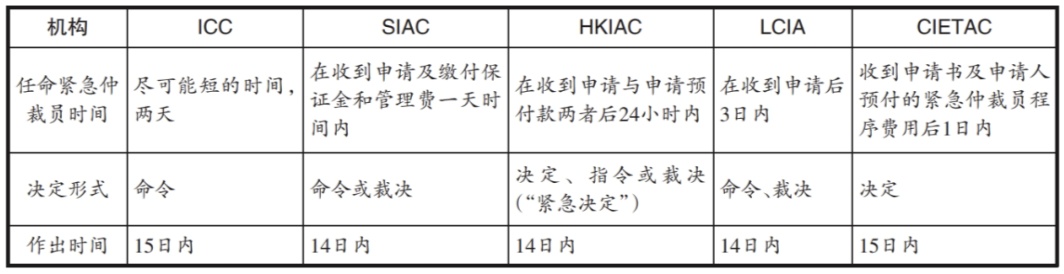 早在2006年ICDR在其仲裁中规则引入紧急仲裁员制度之前,一些国际知名仲裁机构已经有了在仲裁庭成立之前为当事人提供救济的想法,如ICC于1990年试验一种仲裁前的裁判程序,在当事方要求下采用由专家管理的快速和保密程序,免于诉诸国家法院。该仲裁前裁判程序模仿了法国的le juge des refres(紧急开庭的法院)制度,当事人可要求地方法院采取一系列广泛的临时措施,以防止不可挽回的损害。随后一些主要仲裁机构均在其规则中纳入了紧急仲裁员制度,以下为伦敦玛丽女王大学等2021年颁布的《国际仲裁调查》显示的最受欢迎的五个仲裁机构——国际商会(下称“ICC”)、新加坡国际仲裁中心(下称“SIAC”)、香港国际仲裁中心(下称“HKIAC”)、伦敦国际仲裁院(下称“LCI-A”)和中国国际经济贸易仲裁委员会(下称“CIETAC”)的仲裁规则中对于紧急仲裁员程序的规定。