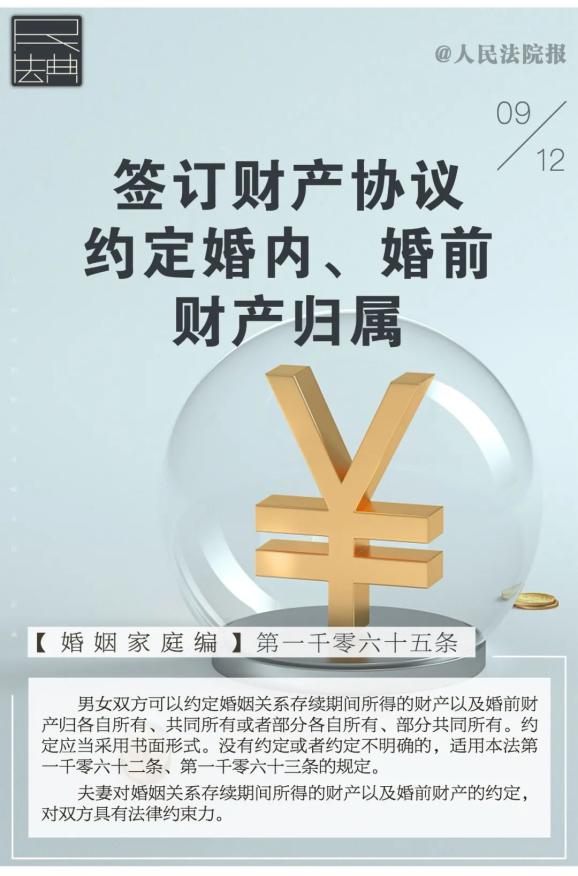 第一千零六十五条 男女双方可以约定婚姻关系存续期间所得的财产以及婚前财产归各自所有、共同所有或者部分各自所有、部分共同所有。约定应当采用书面形式。没有约定或者约定不明确的,适用本法第一千零六十二条、第一千零六十三条的规定。