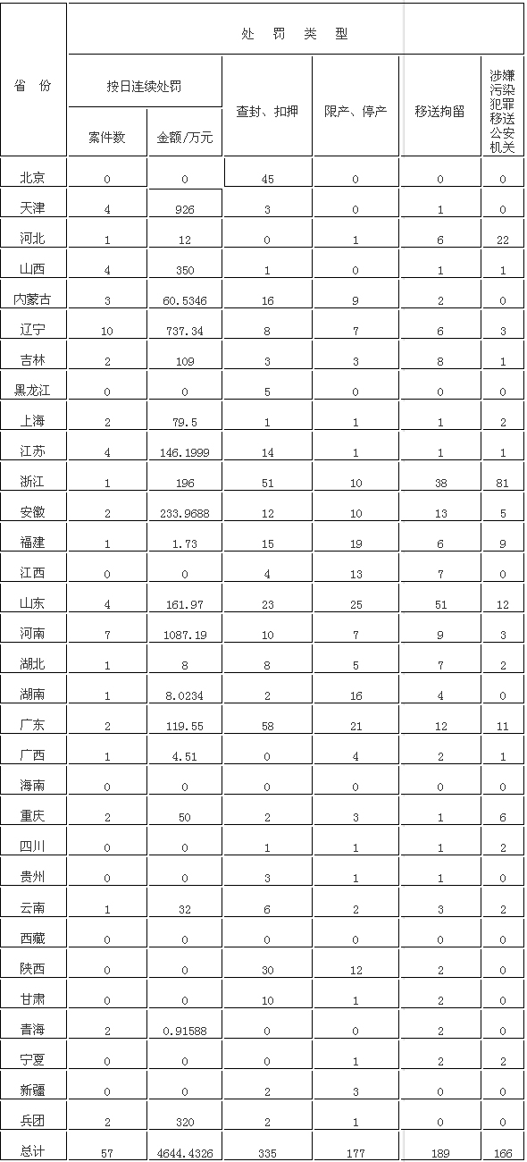 环境保护部环境监察局局长邹首民介绍说,8月,全国范围内实施按日连续处罚案件共57件,罚款数额达4644.43万元;实施查封、扣押案件共335件;实施限产、停产案件共177件;移送行政拘留共189起,移送涉嫌环境污染犯罪案件共166件。与7月情况相比,适用按日连续处罚案件数量基本持平,适用查封扣押案件数上升31%,适用移送涉嫌环境污染犯罪的案件上升34%,适用移送拘留案件数上升29%,限产、停产案件数下降30%。