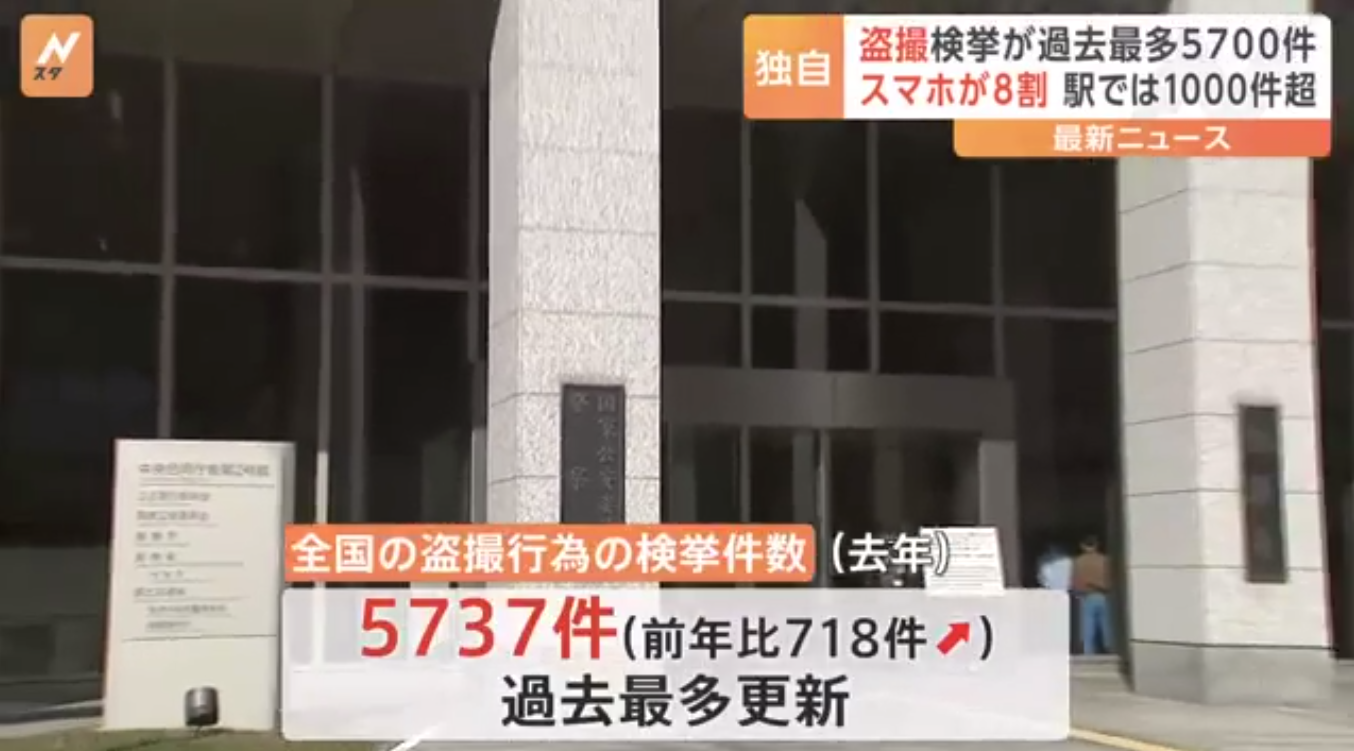 2023年5月,日本警察厅公开了过往一年日本全国的偷拍报案数约为5700件,创历史最高记录,比前一年增加了700多件。而其中约4500件是手机偷拍,占比近8成。发生在洗手间、浴室、更衣室的案件约1800件,车站内的楼梯、电梯约1100件,两者合计将近3000件,差不多是偷拍案件的一半。