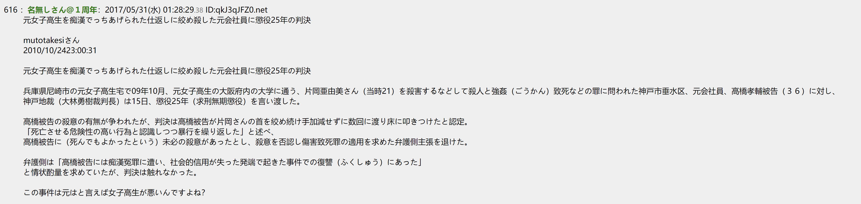其中最为恶劣的一个事件,现在媒体报道已被删除得一干二净,只能在一些论坛上还零星留有当初的报道:2009年10月,曾经被诬告痴汉而失去了一切的一名男子,将已经成为大学生的原告女性先奸后杀,凶手最后被判25年。