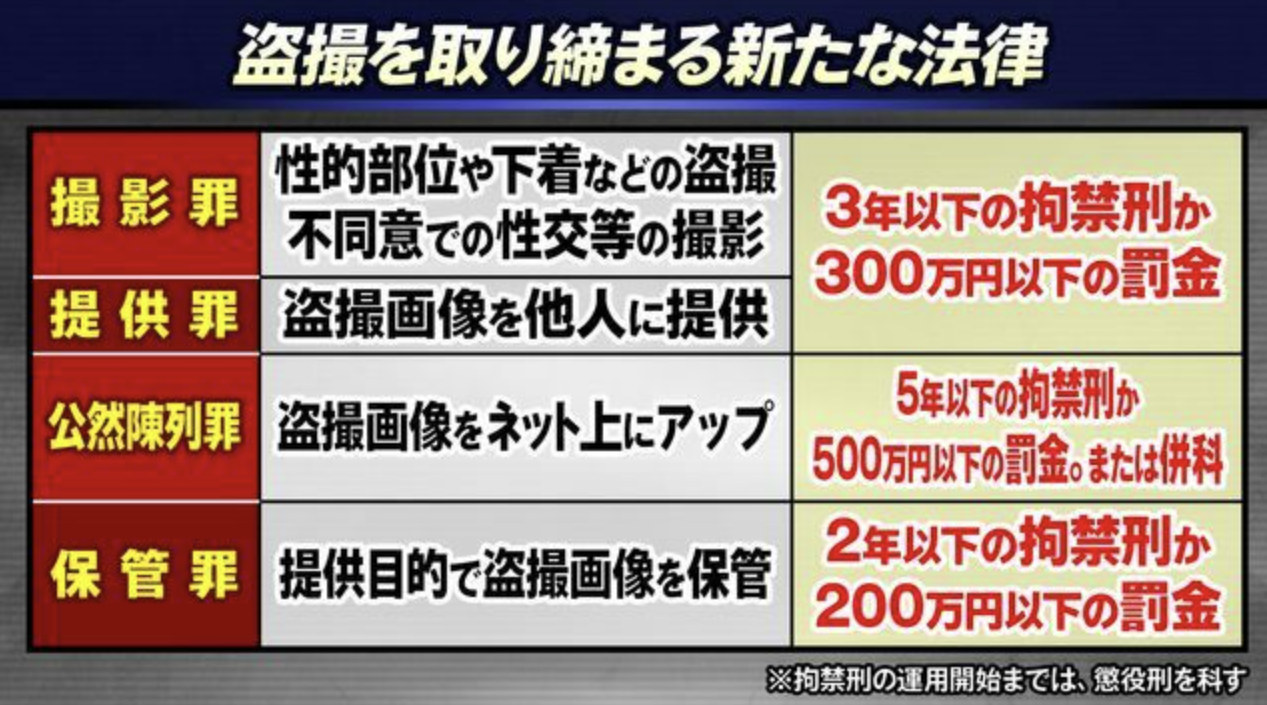 在日本,目前对偷拍的处罚还是蛮严厉的。2023年6月16日,日本国会确立了一项新的罪名——拍照罪(摄影罪)。这条新法律针对一般意义上的偷拍行为进行全面强化打击。